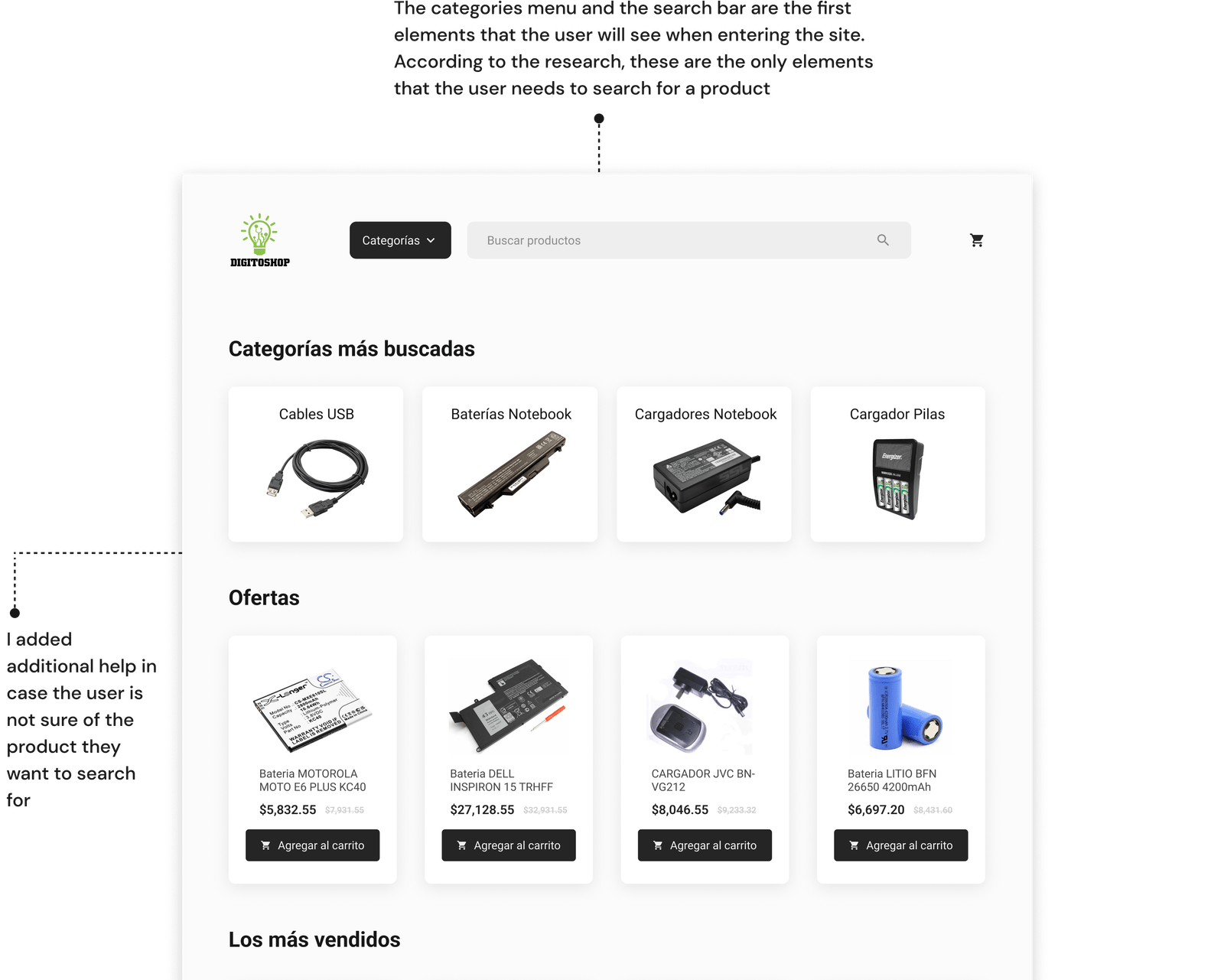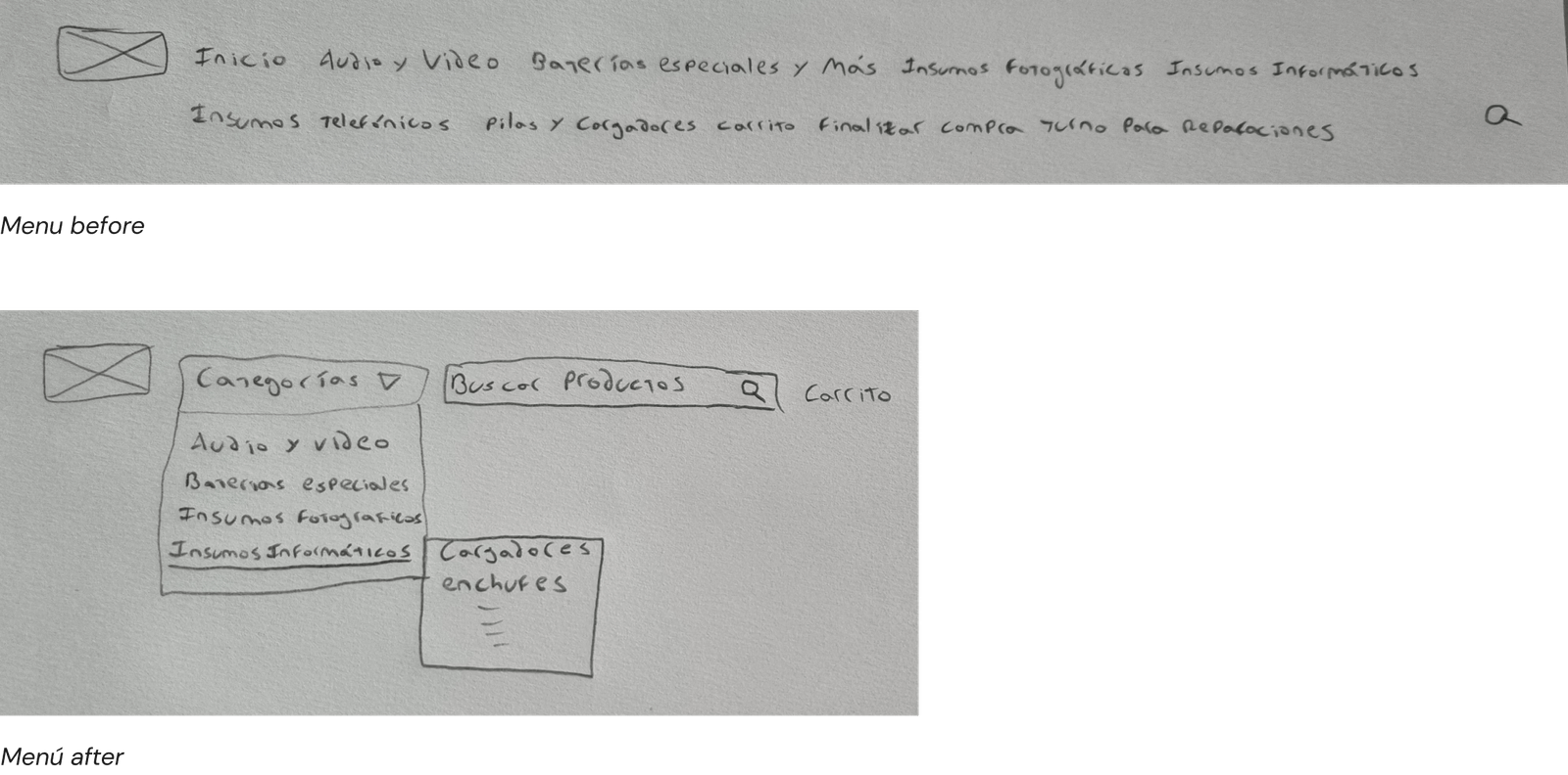 My goal when designing the sketches was to improve the product search experience by prioritizing the search form and organizing the main menu more effectively so that it included all the necessary categories.
